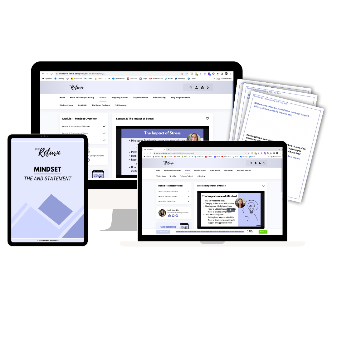 Unlock free access to 3 video lessons inside my self-paced course, The Return. Learn why mindset is key to making peace with food and how to start rewiring your neural pathways.